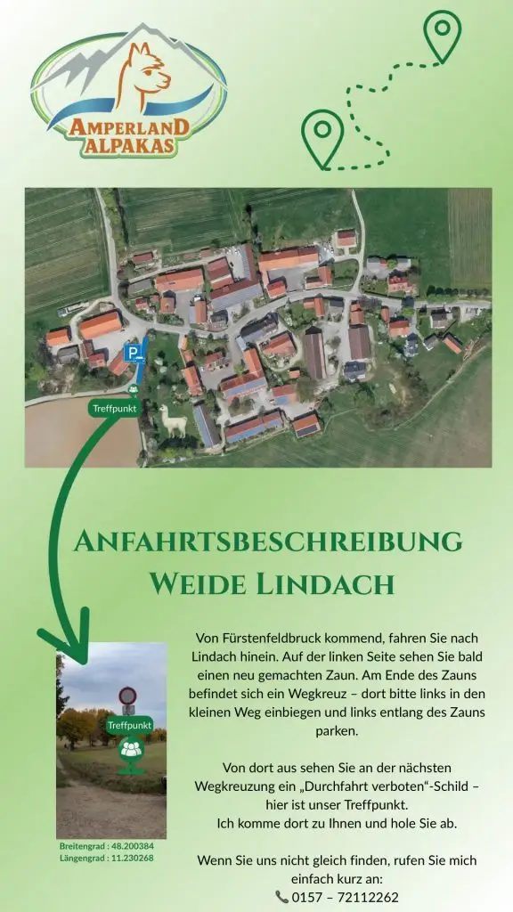Von Fürstenfeldbruck kommend, fahren Sie nach Lindach hinein. Auf der linken Seite sehen Sie bald einen neu gemachten Zaun.Am Ende des Zauns befindet sich ein Wegkreuz – dort bitte links in den kleinen Weg einbiegen und links entlang des Zauns parken.